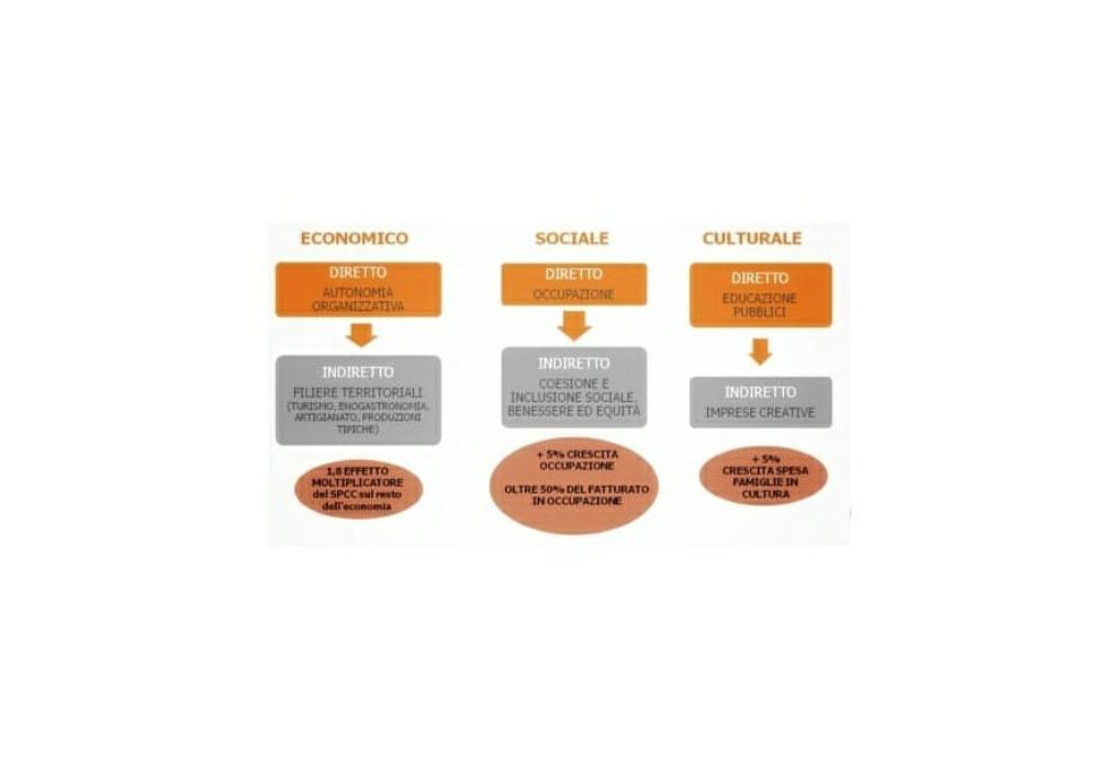 Where the direct economic impact therefore relates to the ability of a company to increase its level of economic and financial autonomy, the indirect one relates to the ability to expand, outside of itself, widespread benefits, involving other actors in the supply chain (tourism, food and wine, crafts, typical products, etc.) in increasingly long and "restorative" value chains with respect to the territory. The most interesting data in this regard today is the multiplier effect of the cultural and creative production system compared to the rest of the economy, which records a coefficient of 1.8.