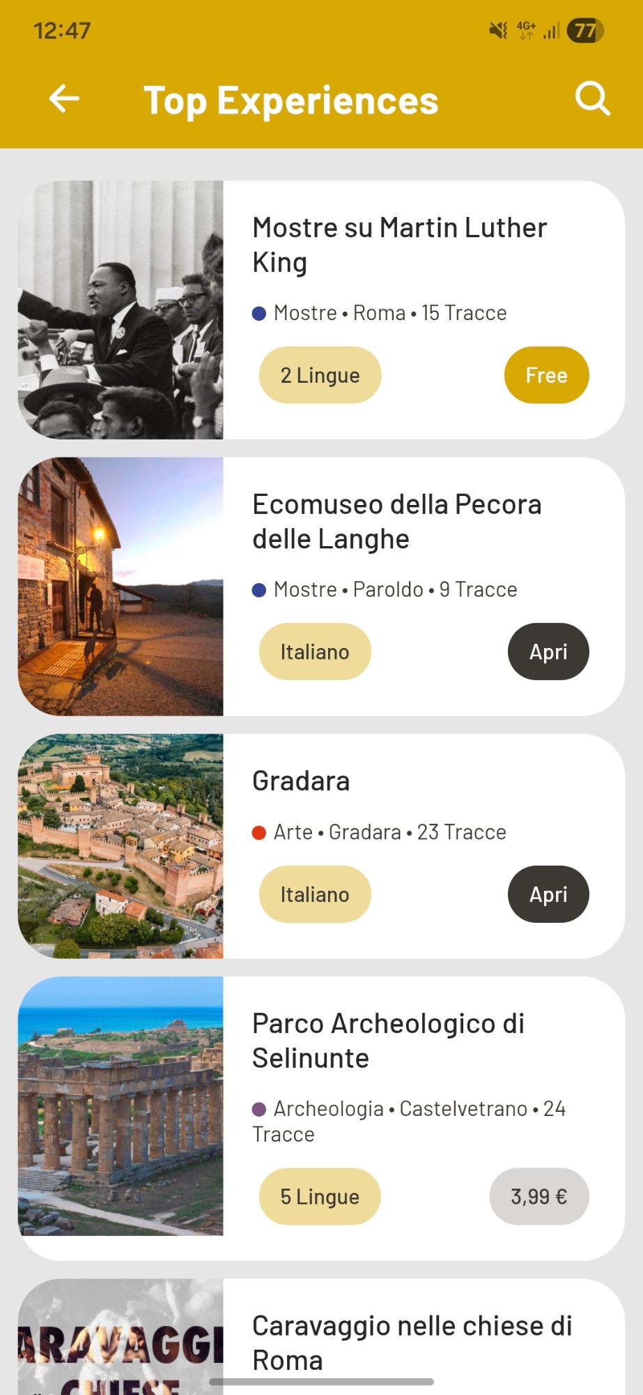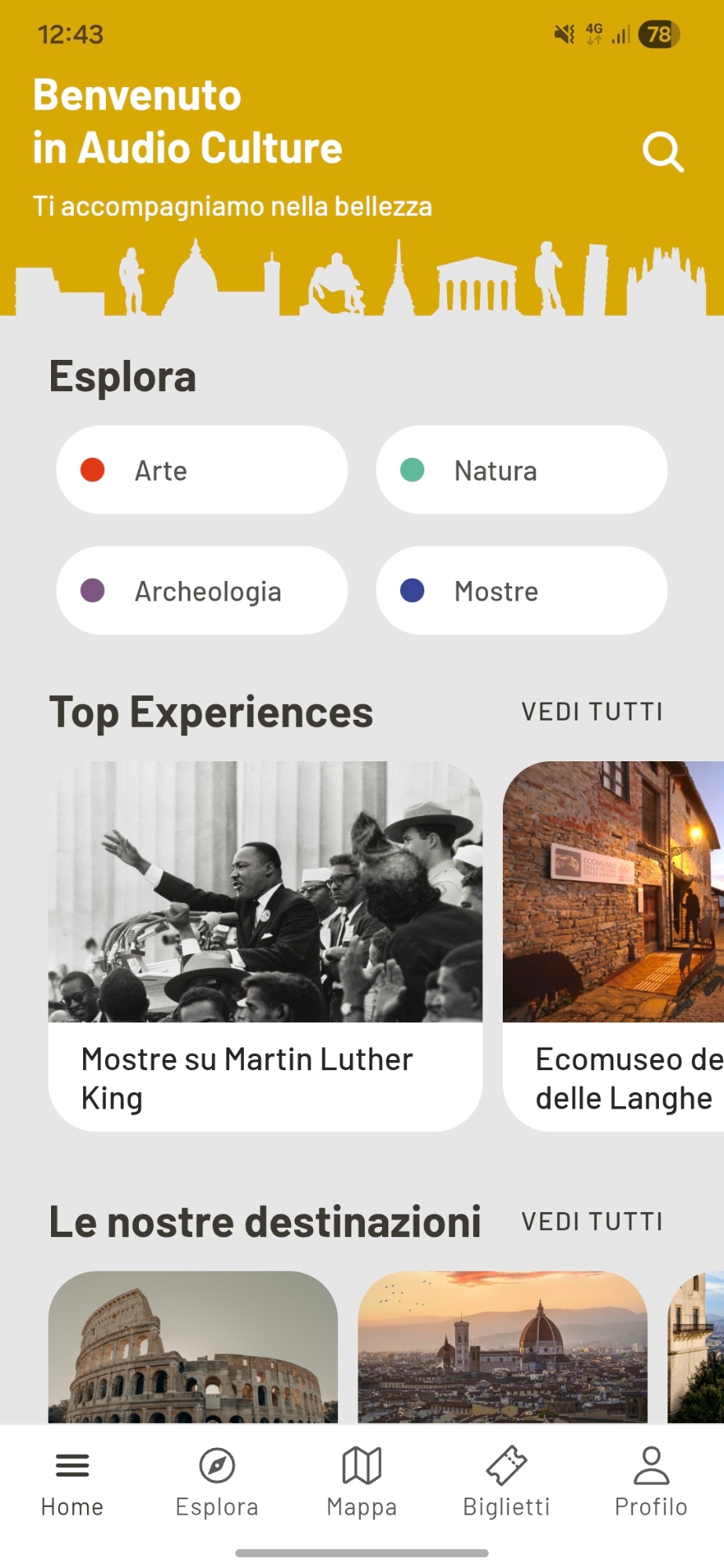 AudioCulture è l'applicazione per gli amanti del patrimonio culturale, naturalistico e paesaggistico italiano. Un catalogo di voci e suoni narranti per diversi pubblici ed esperienze: cammini in natura, itinerari cittadini, percorsi museali, tour in siti archeologici e ambientazioni sonore. Un’offerta ricca che comprende prestigiosi luoghi d’arte e piccoli tesori tutti da scoprire. Ogni percorso è strutturato in un'ampia selezione di ascolti, una galleria d'immagini e mappe di orientamento. Contenuti di qualità redatti e tradotti in molte lingue - sia nell'architettura che nei testi - da esperti del settore, con la supervisione scientifica delle istituzioni di riferimento. Uno stile di comunicazione immediato ed un linguaggio semplice, adatto a tutti, indipendentemente da attitudini e abilità.